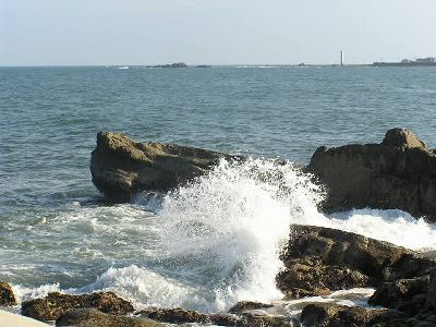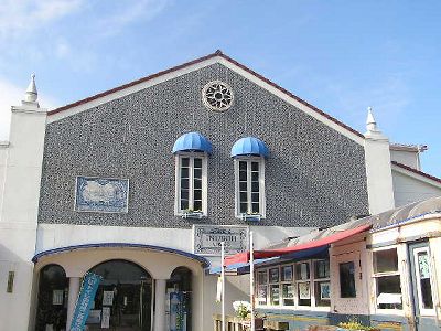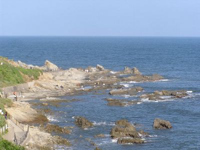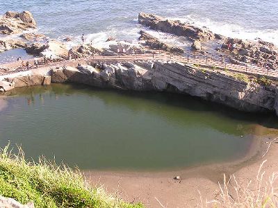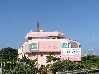 犬吠埼灯台に向かって歩いていくとなんか変なピンク色の建物が。マリンパークの水族館だった。