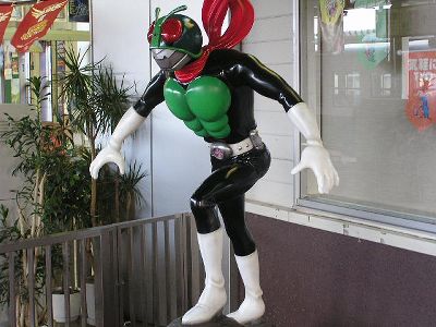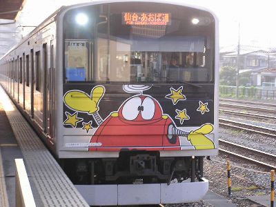 来た電車(仙石線)もマンガ列車。ロボコン、ゴレンジャー、仮面ライダーなどなどが車体に。