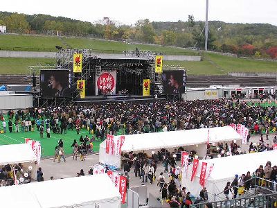 夕方になると藤村Dの事前の警告どおり寒くなってきた。さらに17時半からのライブの最中には雨まで。レインコート(傘は禁止)もダウンもちゃんと指示どおり持って来たからいいけど。18時からのイベントはトークからではなく、まずYOSAKOIソーラン常連のダンスチーム「平岸天神」の踊り(「水曜天幕團」オープニングの踊りと今年のYOSAKOIソーランで踊った踊り)。YOSAKOIソーラン自体は何がいいんだかちっともわからないが、1チームだけ見る分にはまあいいかも。そして5人がステージに上がると最初に「強烈な晴れ男」森崎博之を呼び込む。でも「メールがしゃべり言葉そのままでうっとうしい」とか言われ、シャウトしただけですぐ退場。夜の部のメイン企画はなんと10/19から北海道で放送される(道外は宮城のみ放送決定、東京は未定)2005年新作第1夜の「先行上映」。テレビ番組の先行上映なんて聞いたことがない。藤村Dが「一度生で客の反応を見てみたい」と思っての企画らしいが、視聴率に影響するであろうになんと大胆な。去年からの長〜いフリで「スペインの牛追いか?」と思わせておいてやっぱり、な新企画はこれもやっぱり第1夜では目的地に到達しないまま終了。観客「え〜〜〜〜〜」「ここで終わり?」「またかよ!」「なんだよ最後の字幕!」次がいつ見られるかわからない道外勢(宮城でも12月)にとってはまさに「生殺し」状態。藤村D「その顔を見たかった!」こいつも悪意の固まりだ。