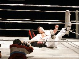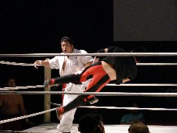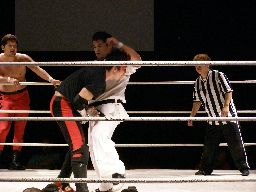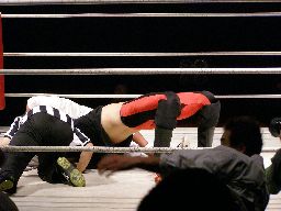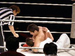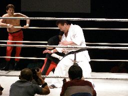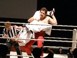 石川アングルスラム風の投げ(右写真)、足を取るが小笠原は下から石川の頭を蹴る、松崎にタッチ。