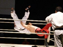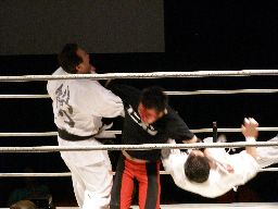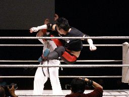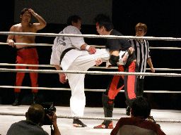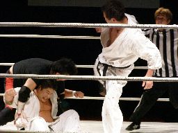 松崎ヒザ蹴り(右写真)、顔面踏み付け。