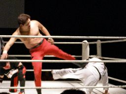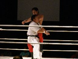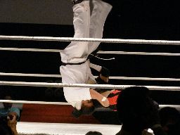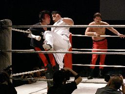 まだ赤い紙テープが飛ぶ中空手軍団(和彦'S)が先制攻撃(右写真)。4人とも場外に。場外では3人目の空手軍団も手を出し観客をヒートさせる。小林昭男みたいな存在か?