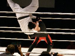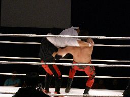 ポイズン入ってダブルのブレーンバスター(右写真)、石川がカバー、カウント2。石川コーナーに振って串刺しのヒザ蹴り、2発目松崎かわしてスクールボーイ、カウント2。