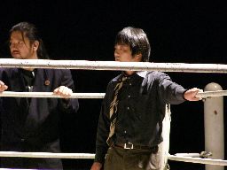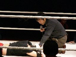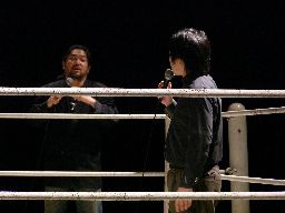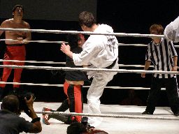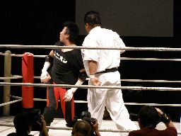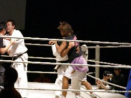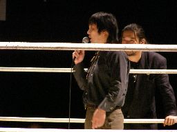 武井氏が間に入って乱闘を止める。ポイズンを気遣い(右写真)「松崎!俺の前でそんなに殺し合いやりてーのか?小笠原!これがお前の武士道か?」とマイク。