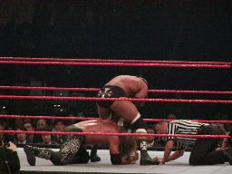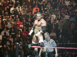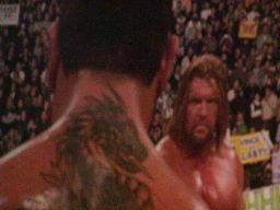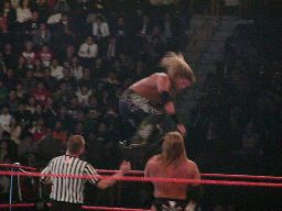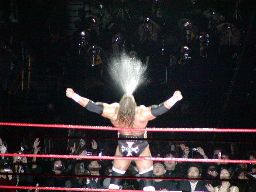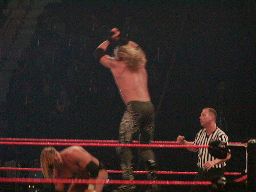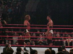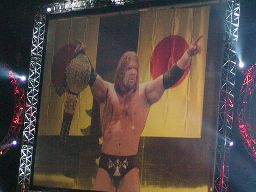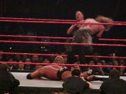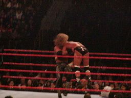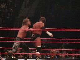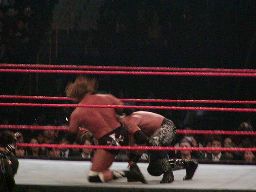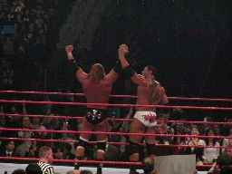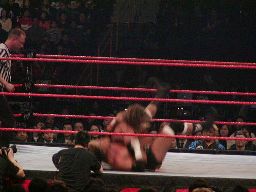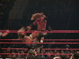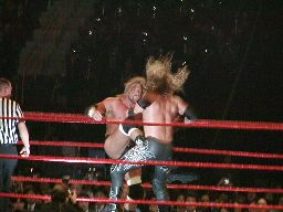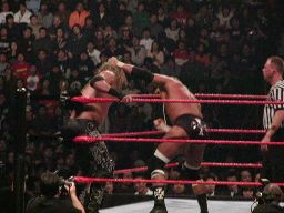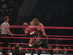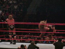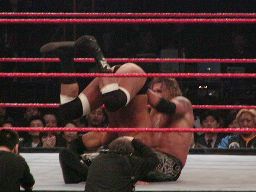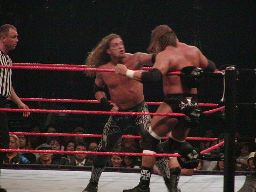 パンチの打ち合い(右写真)、エッジが不意を突いてスピアー。エッジコーナーに振ってもう一発スピアー、HHHかわす。