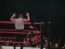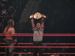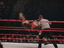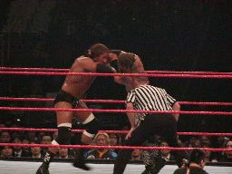 2度目はHHHブレーク。エッジスピアー、HHHかわしてエッジはレフェリーと激突(左写真)、レフェリーは失神。