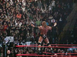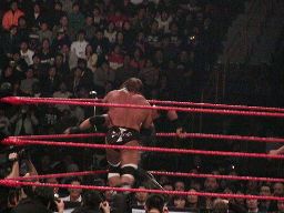 HHHバックドロップ、エッジ着地してパンチ。エッジコーナーに振る、HHH切り返す、エッジキック。エッジコーナーに上ってダイブ、HHHは下からキック(右写真)。