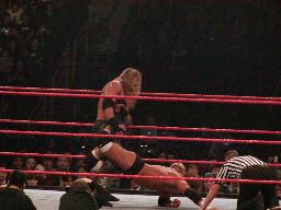 エッジはエッジオーマチックからカバー(右写真)、しかしレフェリーはカウント不能。フレアーがイスを持って入ってくる。エッジはスピアー。