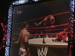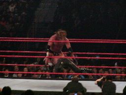 エッジがイスを手にする。HHHはかわしてバックドロップ。両者ダウン。イスの取り合いになるが、バティスタが入ってきてイスを取り上げる。どっちの味方だ?エッジがエプロンに出る(左写真)。HHHが後ろから突き飛ばす、エッジはバティスタに激突。
