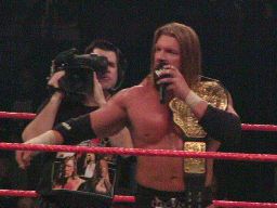 ようやくしゃべり出す。「俺たちはアメリカからはるばる日本にやってきた。日本はまるで故郷のようだ。なぜならキミたちファンは俺たちと同じものを信じている。キミたちは俺たちそのものだ。俺たちはがんばった。キミたちもがんばった。両方揃ってWWEなのだ。控室にいる全員が、キミたちの前で力いっぱい演じ、試合をしようと心がけた。この会場にいるすべてのファンがそれに応えた。キミたちひとりひとりがWWEなのだ。WWEは日本が大好きだ。そして私個人も日本が大好きだ。また会おう。声を聞かせろ!」観客「Yeah!」