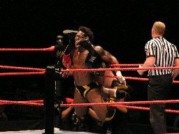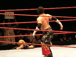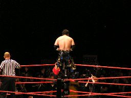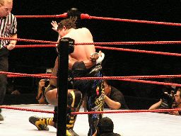 タジリがコーナーに上る、ジョーダンスーパープレックス。
