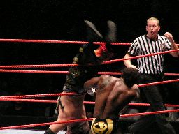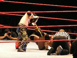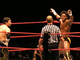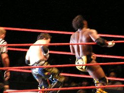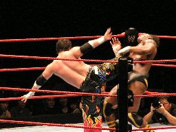 タジリロープに振る、ジョーダン切り返す、タジリはハンドスプリングエルボー。