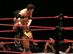 「ニッポン、チャチャチャ」コールの大きさに嫌気が差して花道を戻ろうとしたジョーダンをタジリが急襲、リングに連れ戻す。