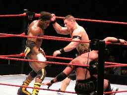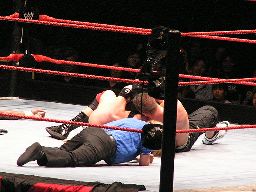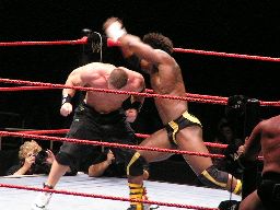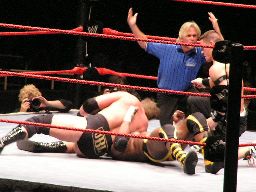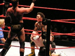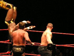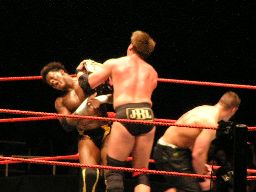 JBLをコーナーに振ってスプラッシュに行くがJBLはレフェリーのチャールズを巻き込ませる。