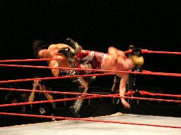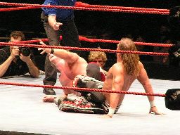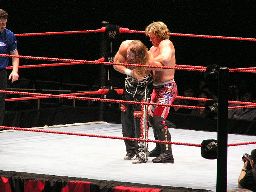 しかしエプロンに着地したHBKはトップロープ越しにヘッドシザーズで捕らえ、逆にジェリコを場外に落とす。