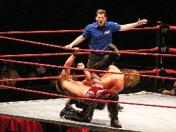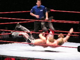 ヘッドロックから変形のかわづ落とし、カウント2。