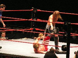 ジェリコ引っくり返す。HBK回転、ジェリコはロープに。