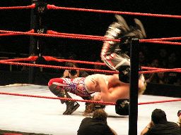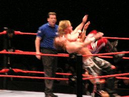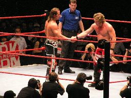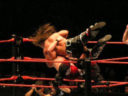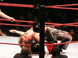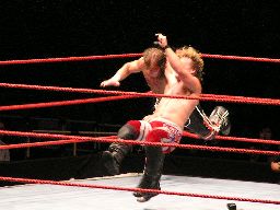 HBKコーナーに振る、ジェリコ切り返す、HBKコーナーに飛び乗る、ジェリコ後ろから捕まえてバックスープレックスに、HBK体をひねっておしつぶす、カウント2。