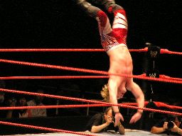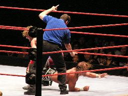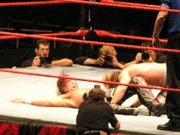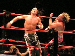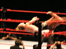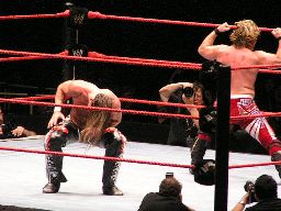 ジェリコがHBKをコーナーに上げる、HBKはジェリコを突き落とす。