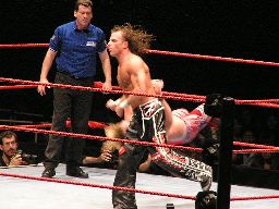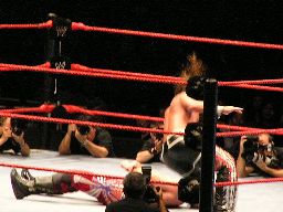ジェリコがコーナーでステップ踏んでスウィート・チン・ミュージック。カウントは2。
