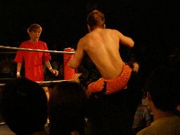 、そしてシーマ・ザイオンとKUDO。最後に景虎と卍丸が。6人タッグか。卍丸はビールの缶を振って客席にぶちまけながら出てくる。みんな卍丸がそういうことをするという予備知識がないのでモロに浴びてしまう(知識があれば避けられるからいいって問題でもないが)。「キチガイ」キャラだかなんだかしらないが、こういう直接的な迷惑がかかるのはやめて欲しいなあ。乱戦でスタート、景虎とSUSUMUがリングに戻る。景虎逆水平(左写真)。ロープワークからSUSUMUはコルバタ。