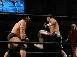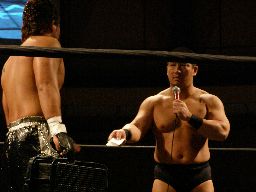 マエストロとHARASHIMAチョップの打ち合い(右写真)。マエストロコーナーに振る、HARASHIMAコーナーに飛び乗って反転クロスボディに行くがロープが緩くて失敗。太にタッチ。