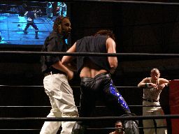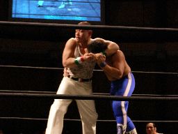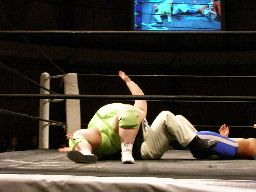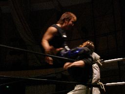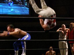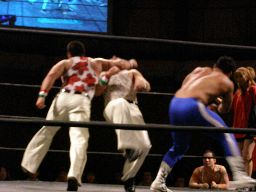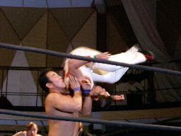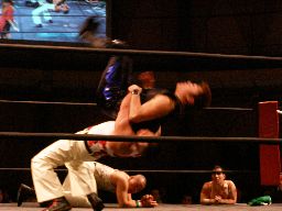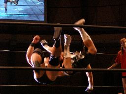太コーナースプラッシュ、コロニー落とし(右写真)、マエストロかわす。アントンが入って延髄斬り。