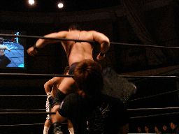 ベルナルド入ってストンピング、コーナーでパンチ(4発)。ベルナルドブレーンバスター狙う、諸橋ブロックして逆に投げる(右写真)。HARASHIMAにタッチ。