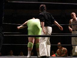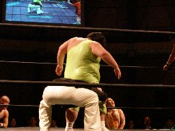 マエストロが太をコーナーに固定して逆水平(右写真)、場外に落とす。場外ではトーゴーがパンチ。太は「もむなー、もむなー!」と叫んでいたがどこをもまれてたのだろう?5分経過。