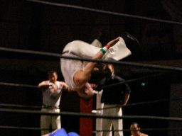 チョップの打ち合い、ベルナルドパンチ。ボディスラムからエプロンに出るとスワンダイブ式サマーソルトドロップ(左写真)、カウント2。マエストロにタッチ。