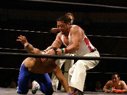 マエストロボディスラム、エルボードロップ、カウント2。トーゴーにタッチ。トーゴー鼻の頭にエルボースタッブ、この一撃で諸橋は鼻から出血。トーゴーさらにナックル。コーナーに戻ろうとする諸橋をトーゴーが引きずり回す(右写真)。トーゴーロープこすり、ストンピング。ボディスラムからエルボードロップ、カウント2。マエストロ呼び込む。