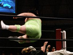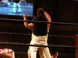 コーナーで待っていたトーゴーはフロッグスプラッシュに切り替える、(右写真)、しかし固い太の腹に自分がダメージ。