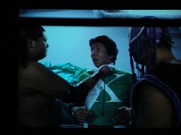 東軍控室。大鷲と宇宙がにらみ合い、仲裁しようとしたキャプテンのゴージャスは2人にシメられる(左写真)。