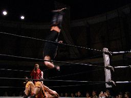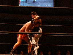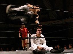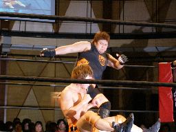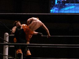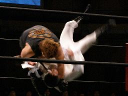 橋本はボディスラムで投げてコーナー最上段からのアトミコ(右写真)、カウント2。MIKAMIにタッチ。MIKAMIニーリフト、ターンバックルにぶつけて逆水平、対角線コーナーに振ってジャンピングハイキック、カウント2。チョップの打ち合い、MIKAMIサミング、橋本にタッチ。