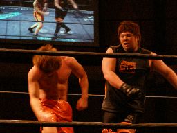 高梨チョップ連発、橋本は張り手一発で返す(左写真)。橋本ミドルキック、カウント2。5分経過。