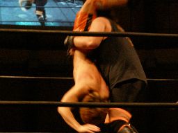 先発はMIKAMIと大家。ロックアップからバックの取り合い、首の取り合い(右写真)。大家腕取ってホイップ、ハンマーロック。フライングメイヤー、足のすくい合い、ブレーク。大家は高梨にタッチ。