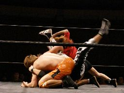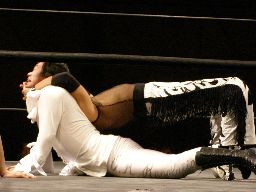 MIKAMIフェースカットからブーメラン狙う、大家カウンターのスピアー(右写真)。大家がジャーマン、高梨がエビ固め、カウント2。