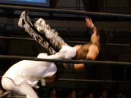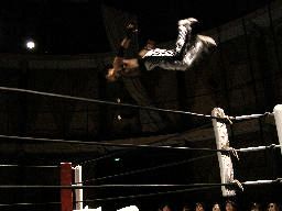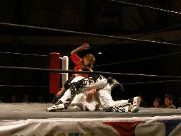 MIKAMIがトップロープ越しのアトミコ(左写真)、カウント2。MIKAMIナックルパンチ、コーナーでエルボースタッブ、橋本にタッチ。