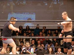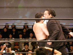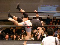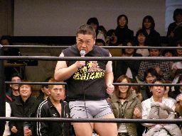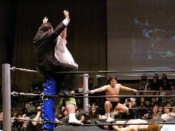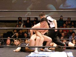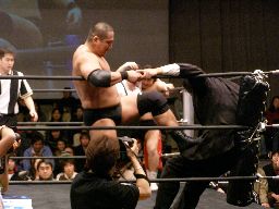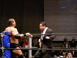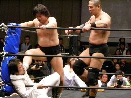 泉州が高木をオーバーザトップロープで落としにかかるが三和太と三和会長が一緒にリングイン、カット。三和兄弟は泉州にダブルのショルダーブロック(右写真)。