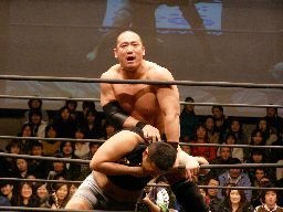 三和兄弟がコーナーに上り、曙と力皇の合体技「リキボノスプラッシュ」を狙う(右写真)。