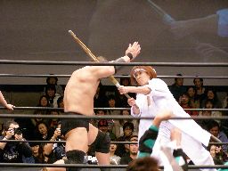 高木と泉州が踏みつけ(右写真)。高木は一発打つごとに「プロレスやめろ!」などと叫ぶ。泉州が大家にブレーンバスター。