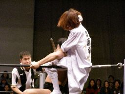 泉州がすぎはらに容赦ない攻撃。コーナーに上げて雪崩式ブレーンバスター狙う(右写真)。