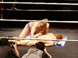 先発は坂井と高蝮。グラウンドで坂井を翻弄する高蝮(右写真)。坂井はストッキングの先を伸ばしてロープエスケープ。レフェリーのビレッジ村杉はこれを認める。