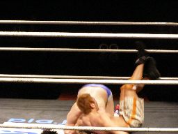 エプロンからスワンダイブミサイルキック、カウント2。高蝮ヘッドロックに取ってダドリードッグ狙う、ディーノブロック、高蝮一回転して背後に着地、DDT(右写真)。高蝮ロープに飛んでイナヅマ、ディーノかわす。