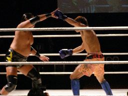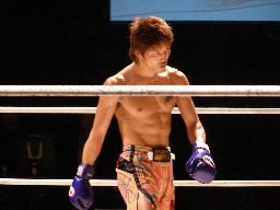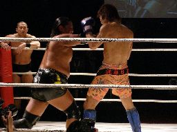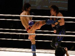 HARASHIMAとキック打ち合い、しかしやはり新田の方が上(左写真)。