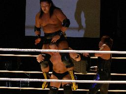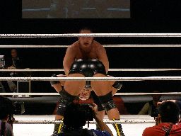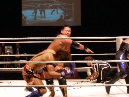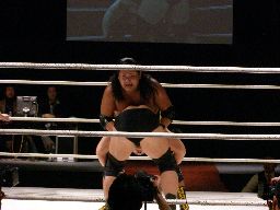 大鷲は腕パンチで高木をコーナーに追い込むと両足で顔に乗る(右写真)。コーナーに連れ戻しHARASHIMAにタッチ。