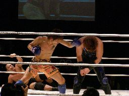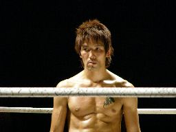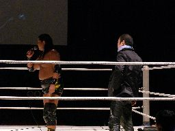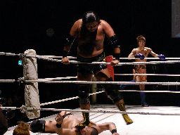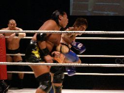 蹴り合いで火がついたのかジェットはHARASHIMAをコーナーに追い込んでボディ一発(右写真)。これはエグい。ジェットは高木にタッチ。
