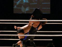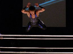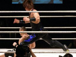 エプロンに出てスワンダイブ式ボディプレス(右写真)、カウント2。