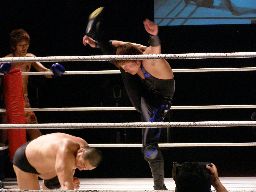 ダブルニー連打から距離を取って顔面にドロップキック(右写真)。5分経過。
