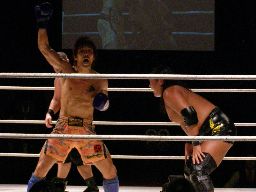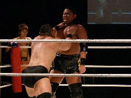 大鷲はショルダーブロックでジェットを吹っ飛ばすが、ジェットは立ち上がるとソバット(右写真)。